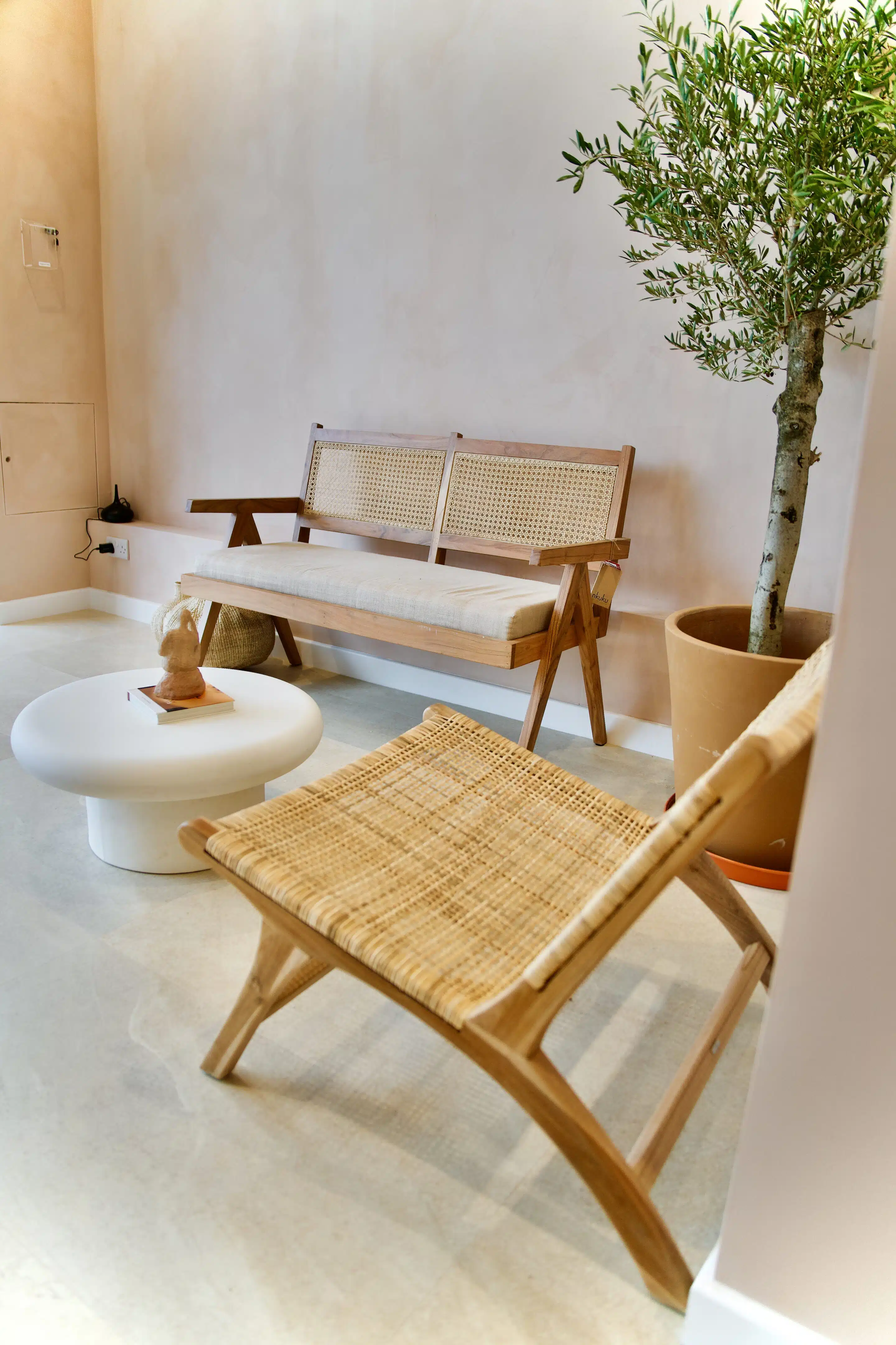 The design incorporated a plaster finish on the wall and concrete effect flooring, complimented by neutral colour tones.
